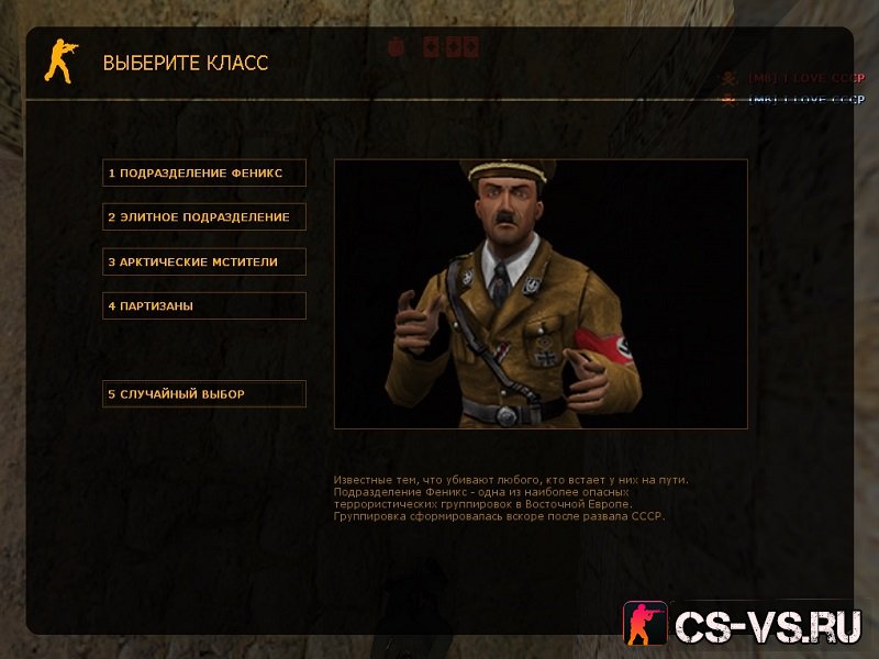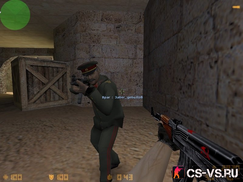 Красивый бэкграунд в Советском стиле. Стандартная модель ножа заменена бутылкой водки; AK-47 с рисунками серпа и молота; Сталин (CT) и Гитлер (TT) в виде противостоящих друг с другом сторон; Конфиг почитателя коммунизма. Клиент русифицирован и готов для работы по сети и с ботами.