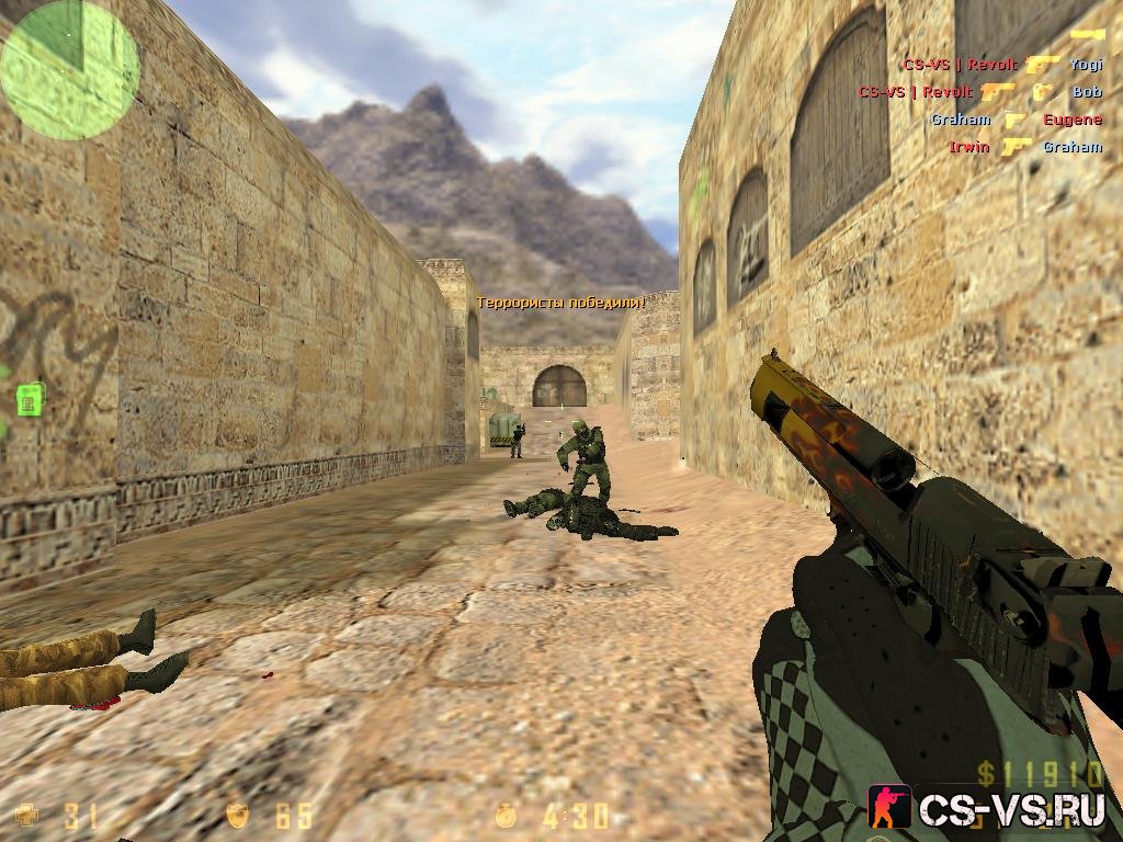 Интересная игра с кучей новых функций и дополнений. Немного о новых «фишках» из Global Offensive – это осмотр оружия в руках. Когда вы не стреляете, оружие автоматически поворачивается для того, чтобы вы могли полюбоваться красивым скином. Но при этом, если вы увидели врага, то сразу можете стрелять. Единственный минус этой особенности – немного загораживается обзор. Добавлены перчатки на руки игрока. Изменены некоторые текстуры на стандартных картах (например, стены, ящики и т. д.). Новая анимация удара ножом. При быстрой атаке вы ударяете врага с разных сторон, при сильной – бьете снизу вверх. Новая анимация перезарядки оружия (например, на АК-47, «эмка» и др.). Обновлена анимация вылета гильз из автоматов и пистолетов. Новые, качественные звуки выстрелов, взрывов, падения гильз и т. д. Эффект оглушения после взрыва ослепляющей гранаты. Добавлена музыка в главное меню. Более 300 серверов. Таким образом, CS 1.6 Revolt не только сохраняет черты классической «контры», но и включает в себя красивые текстуры и оформление из Global Offensive.